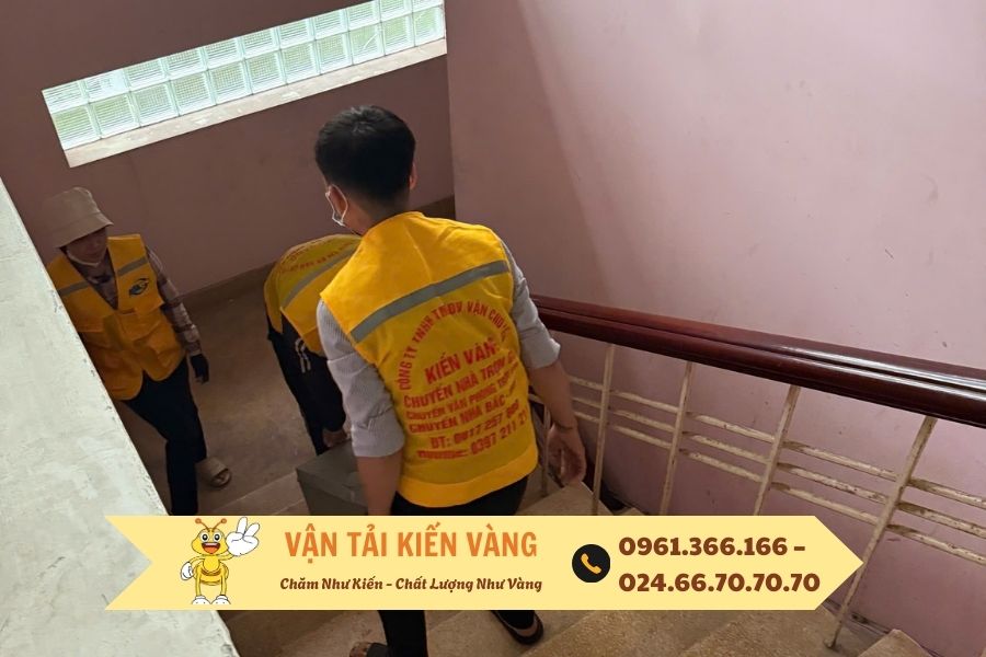 Giải pháp Kiến Vàng: Đội ngũ nhân công của chúng tôi có kỹ thuật xoay chuyển đồ đạc cồng kềnh (tủ quần áo, nệm) ở các góc cầu thang hẹp mà không làm trầy xước tường hay hỏng đồ.